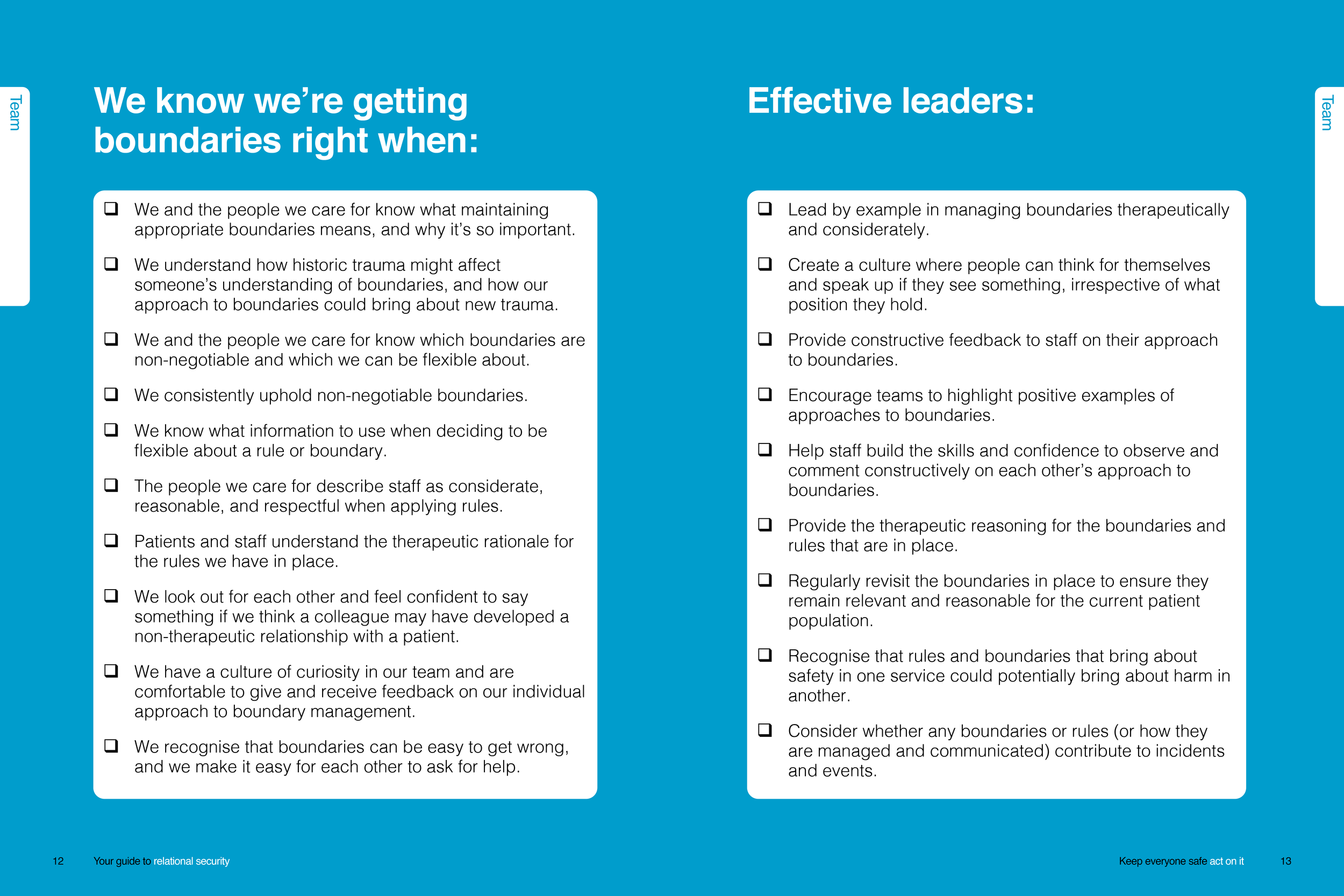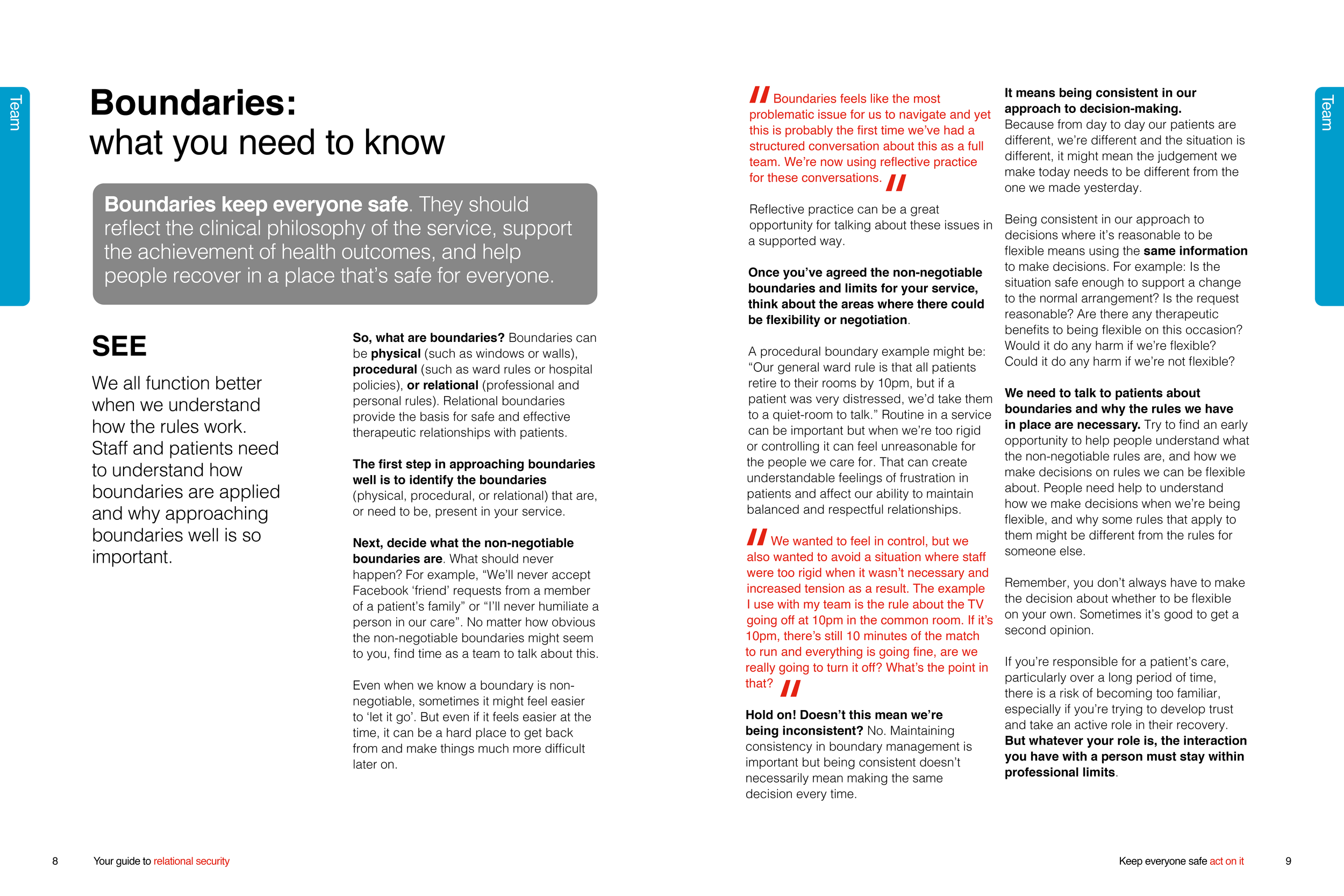 Do staff understand which rules and boundaries are non-negotiable, and those that can be flexed in some circumstances? Are staff confident in their management of boundaries, with an ability to use their therapeutic judgement? Do staff understand how to apply consistency in boundaries they can be flexible about? Do they know what information to use to make that decision? Or, are you left with the impression that staff are uncomfortable to use their judgement, rely on the rules for a sense of control, feel that safety can only be achieved by sticking to the rules, or are overly rigid in their approach?